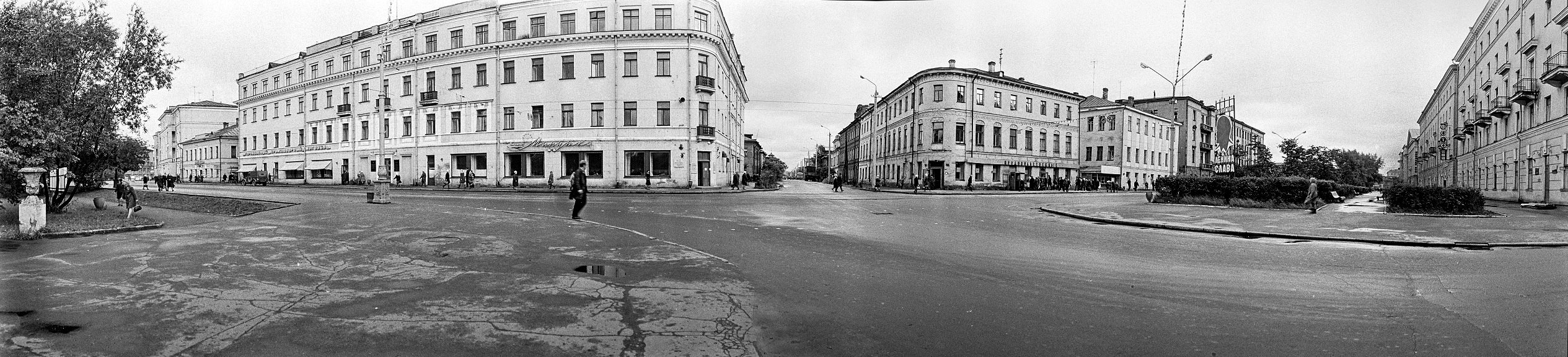 Два фото Управления капитального строительства горисполкома Архангельска составили развернутую, почти 180-градусную панораму проспекта Павлина Виноградова в районе пересечения с улицей Карла Либкнехта.