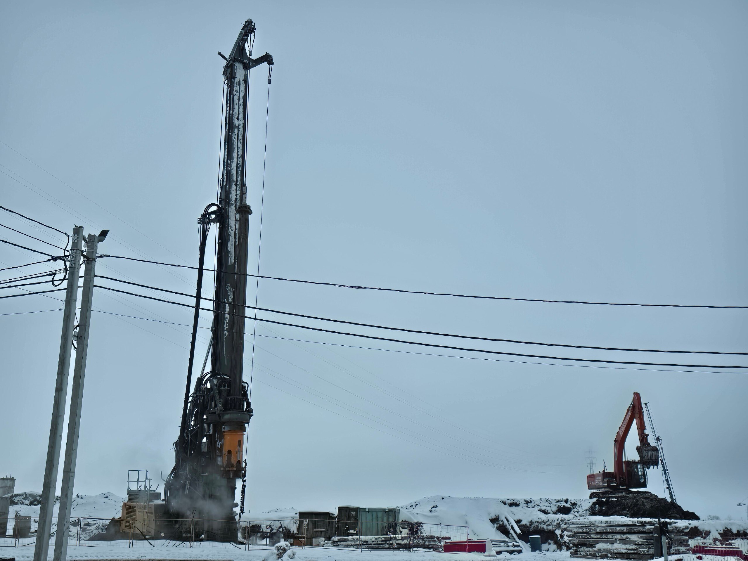 Параллельно с укреплением грунта на площадке активно ведутся работы по устройству буронабивных свай — именно они станут главной несущей конструкцией зданий кампуса. Технология заключается в следующем: сначала в грунте бурят скважины проектной глубины, затем в них опускают арматурные каркасы. После этого скважины заполняют бетоном.