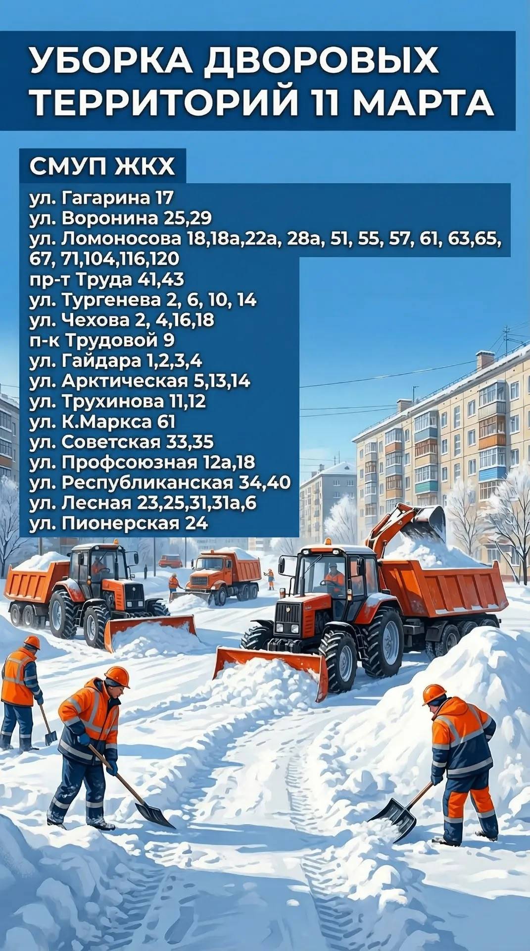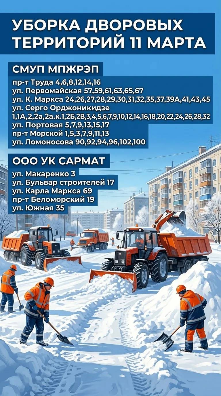 Управляющие компании сегодня работают по этим адресам: уборка дворов и где необходимо - вывоз снега. Прошу вас после окончания рабочего дня проверить территории у вашего дома. Если уборка выполнена в полном объёме - отметьте это в комментариях. В случае выявленных недостатков укажите точный адрес, приложите фото или видео - информация будет оперативно передана исполнителям для устранения