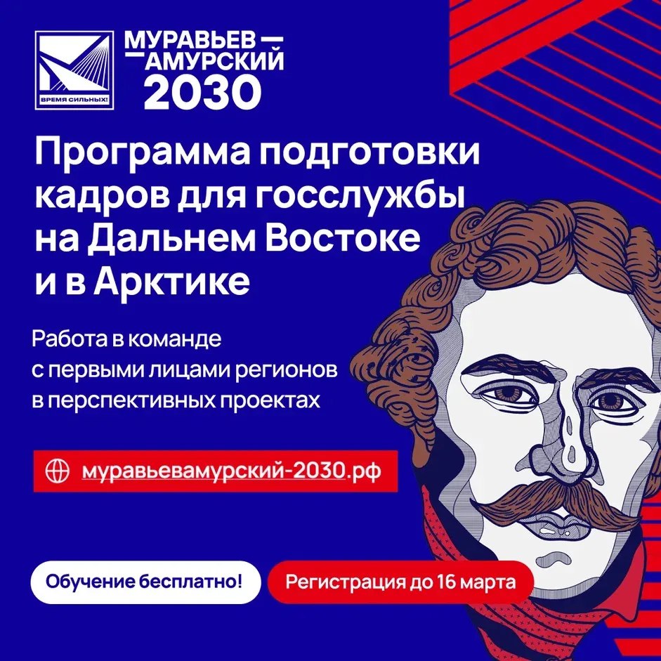 Идеально подходит для тех, кто готов участвовать в разработке и реализации федеральных решений и хочет строить карьеру в госструктурах Арктики и Дальнего Востока. Регистрация проходит до 16 марта муравьевамурский-2030.рф
