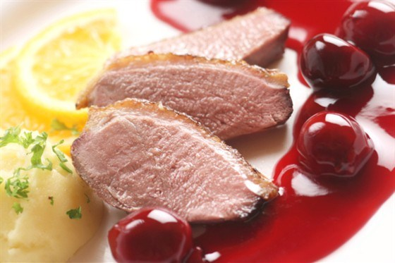 - Нарежьте утку на ломтики и подавайте с вишневым соусом, украсив блюдо свежей зеленью.