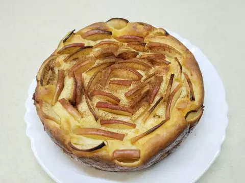 3. Полученное тесто переложить в силиконовую форму диаметром 15 см. Яблоки нарезать тонкими ломтиками и аккуратно вставить их в тесто.