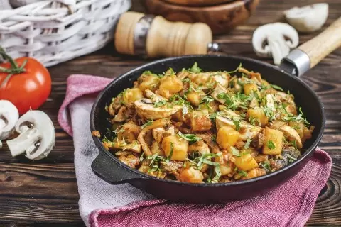 Шаг 1: Начните с подготовки ингредиентов. Очистите картофель и нарежьте его кубиками, натрите морковь на крупной терке, а грибы нарежьте мелкими кусочками.