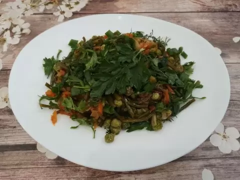 На следующем этапе в сковороду добавляются чесночные стрелки, зеленый горошек и заранее приготовленный острый перец. Все тщательно перемешивается и тушится ещё около 20 минут. По вкусу можно добавить соль. В самом конце готовое блюдо посыпается свежей зеленью для аромата и подачи на стол.