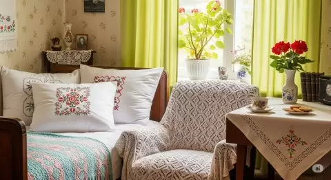 Бабушка всегда подчеркивала: "Без занавесок и пледа в доме пусто, даже если мебель новенькая!" Пледы, кружевные салфетки, подушки и скатерти — эти мелочи формируют гармоничное пространство. Ткань не только сохраняет тепло, но и смягчает шум, создавая уютную атмосферу.