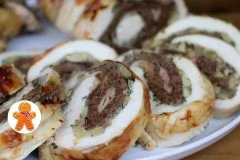 После готовности, рулет необходимо дать немного остыть и удалить бечевку. Затем его аккуратно нарезают и подают к столу, удивив гостей своим изысканным вкусом и внешним видом.