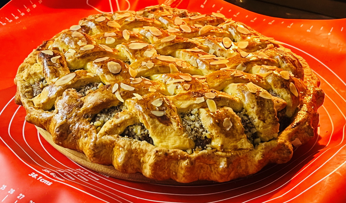 Следует разделить охлажденное тесто на две части: одна часть должна быть больше. Большую часть раскатываем в круглый пласт, на который укладываем джем, равномерно посыпаем орехами. Затем раскатываем вторую часть теста, нарезаем ее на полосы и создаем из них решетку сверху — так пирог станет настоящим произведением искусства. Не забудьте смазать его желтком для получения золотистой корочки и посыпать миндалем.