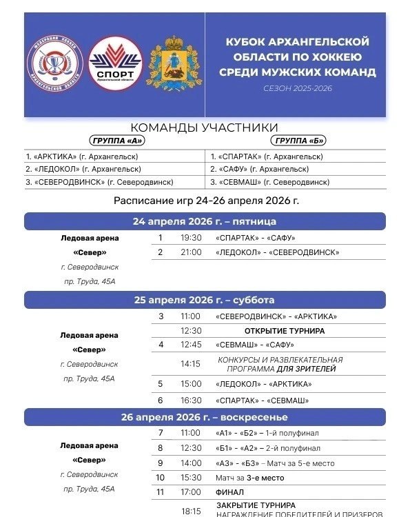 С 24 по 26 апреля на ледовой арене стадиона «Север» (просп. Труда, 24А) пройдёт заключительный турнир сезона.