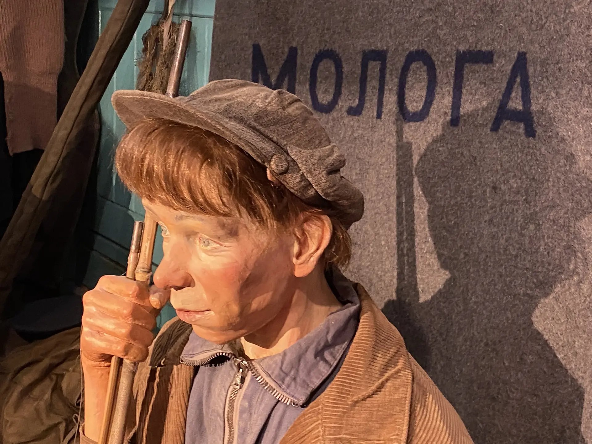 В последнем вагоне гостям предлагают присесть, экскурсанты сами становятся пассажирами: символично вместе с поездом страна катится к послевоенному восстановлению хозяйства.