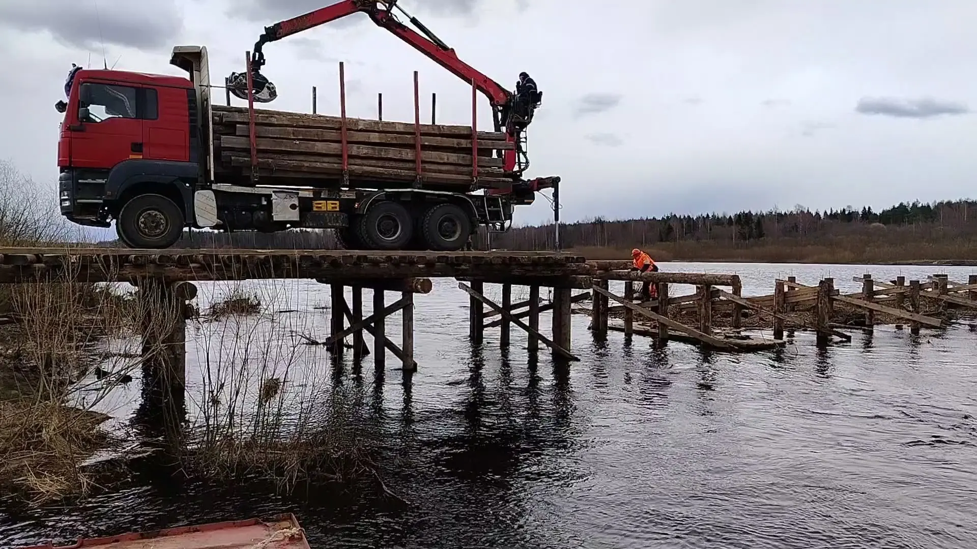 Идт сборка сезонного низководного моста через Вагу у с. Благовещенское. Такой вид работ проводится, по опыту прошлых лет, обычно на месяц позже! Вот такая она, весна-2026.