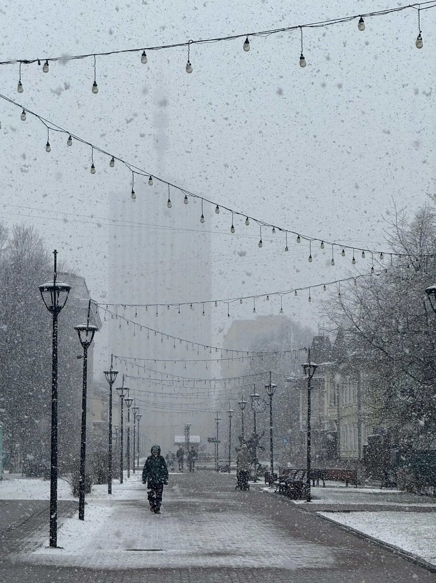 Утро началось с настоящего снегопада: бело, холодно и по-зимнему. А к вечеру город преобразился: снег ушёл, и небо взорвалось шикарным закатом