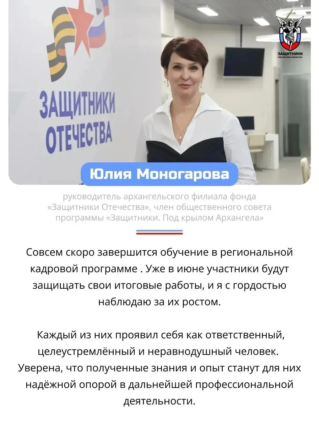 Про участников программы «Защитники. Под крылом Архангела» рассказывает Юлия Моногарова, руководитель Архангельского филиала фонда «Защитники Отечества».