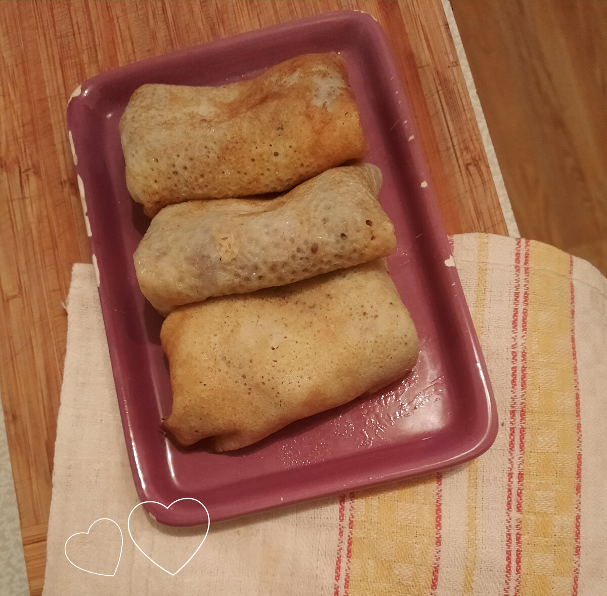 Затем печень и лук смешиваются, добавляются специи по вкусу. Полученную массу измельчают до однородной консистенции с помощью блендера. На каждый блин выкладывается столовая ложка начинки, которая затем аккуратно заворачивается в конвертик. Чтобы блинчики приобрели аппетитный золотистый оттенок, их можно быстро обжарить на сковороде с маслом, хотя это не обязательно.